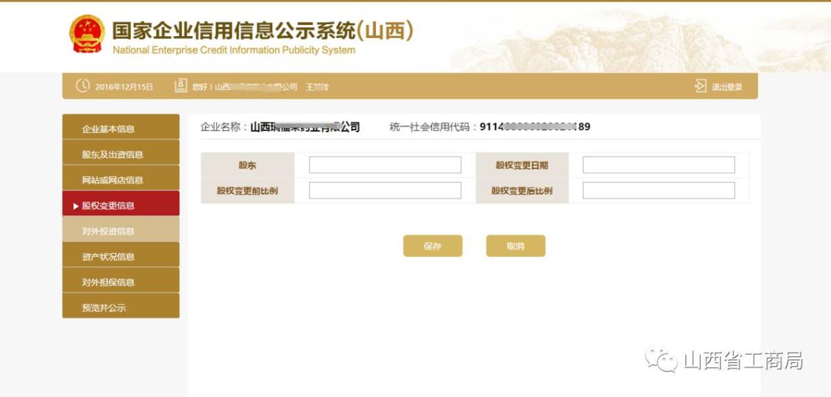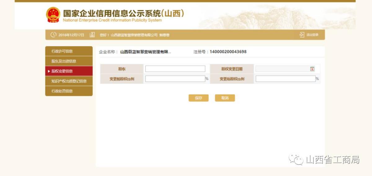 输入变更前跟变更后的股权比例,点击【保存】。