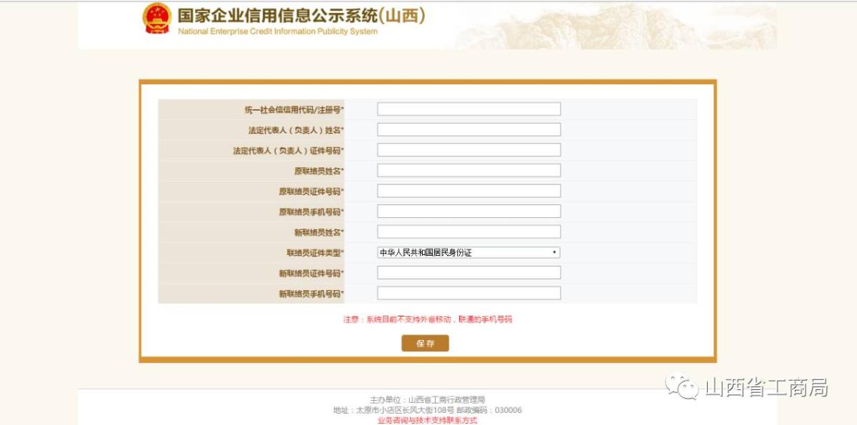 若联络员发生变化,点击【企业联络员变更】,输入原联络员信息跟变更后的信息,点击【保存】。