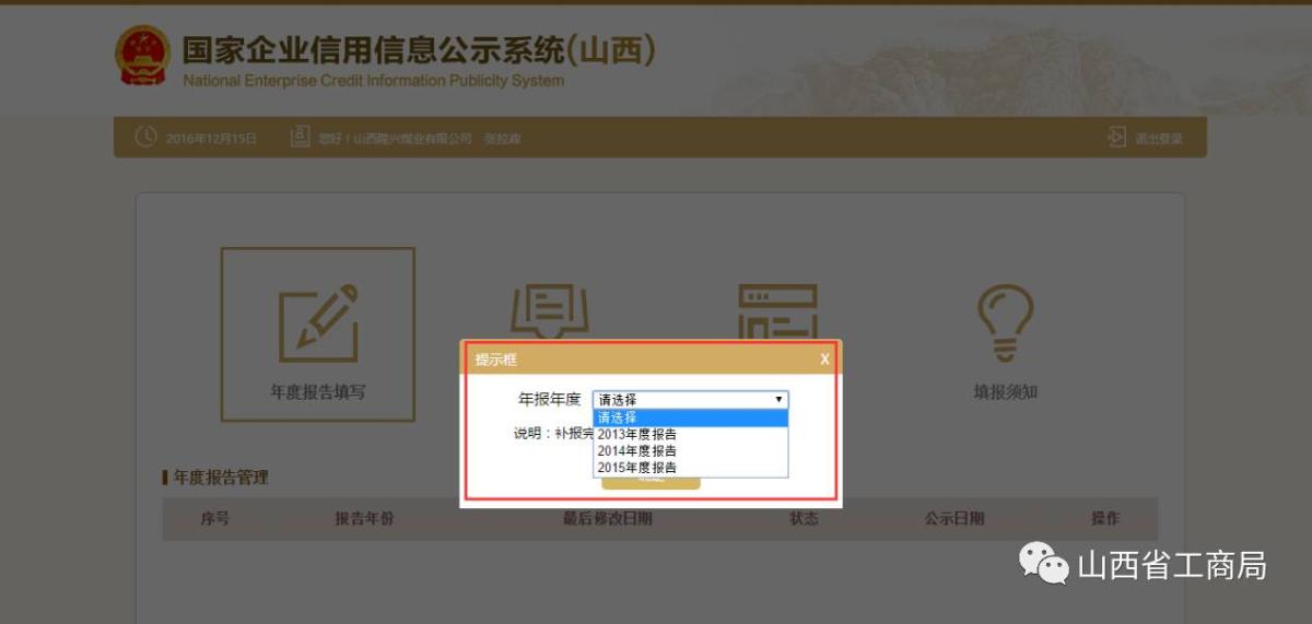 点击【年度报告填写】,选择对应的年报年度,如图: