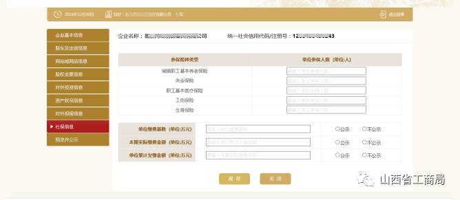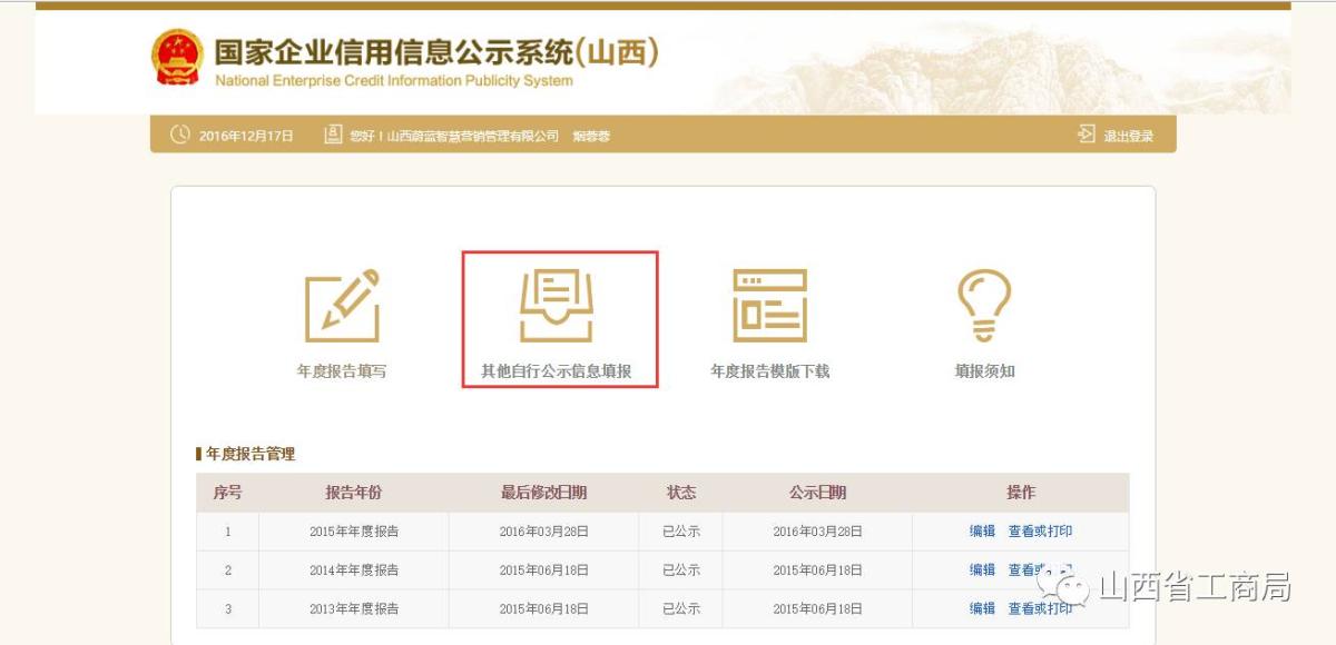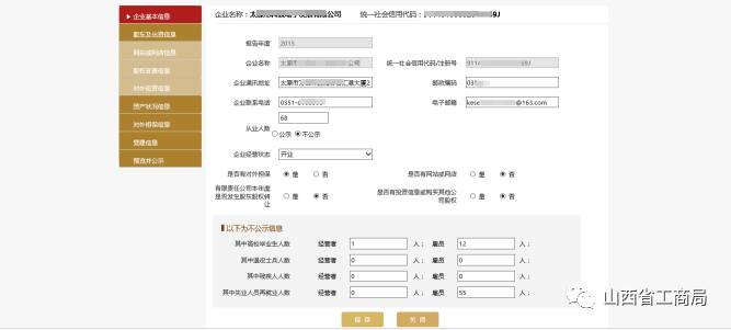 登录国家企业信用信息公示系统(山西),域名:http://sx.gsxt.gov.cn。点击【企业信息填报】,注:2016年度年报信息添加人社信息填写。
