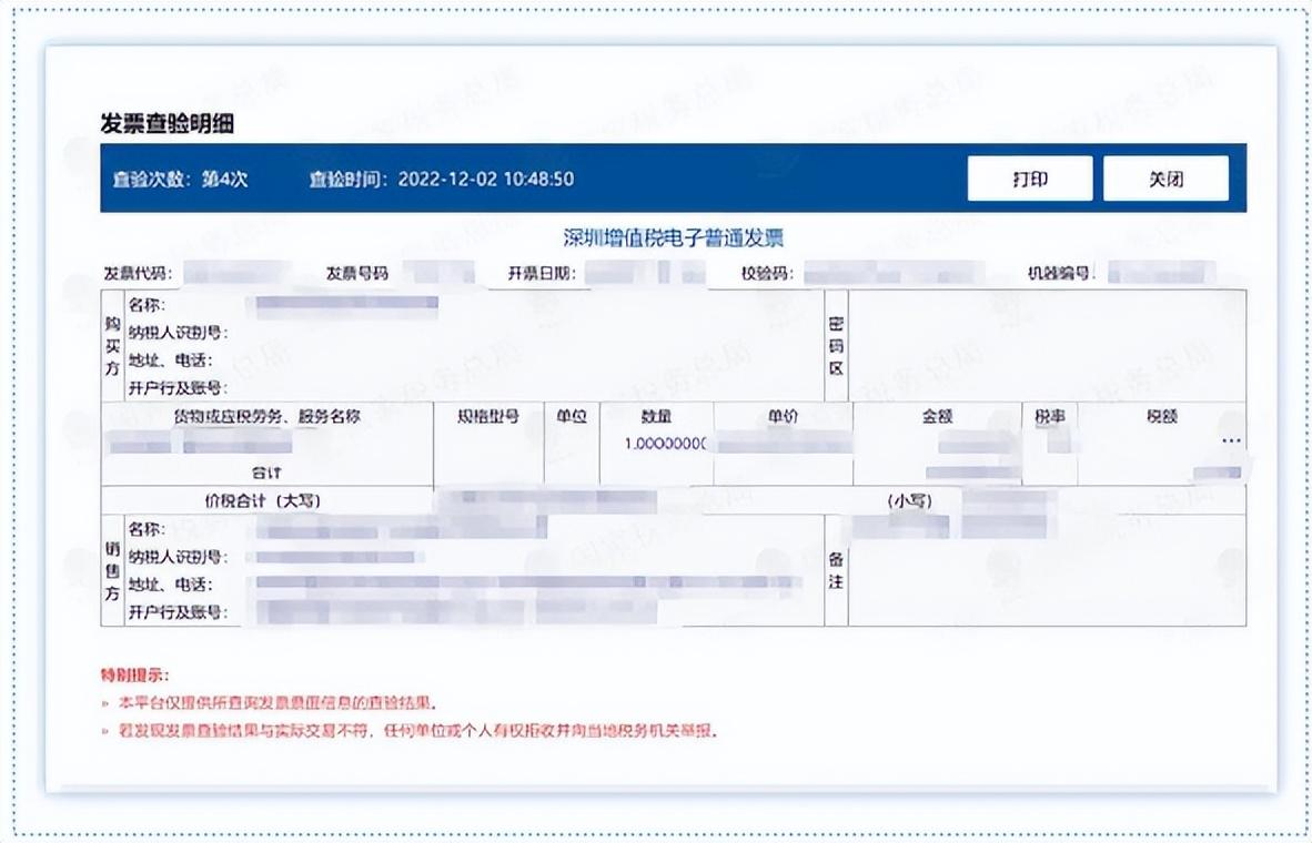 情况1:纳税人输入的发票查验信息与税务机关电子信息一致,可显示出相关发票明细。
