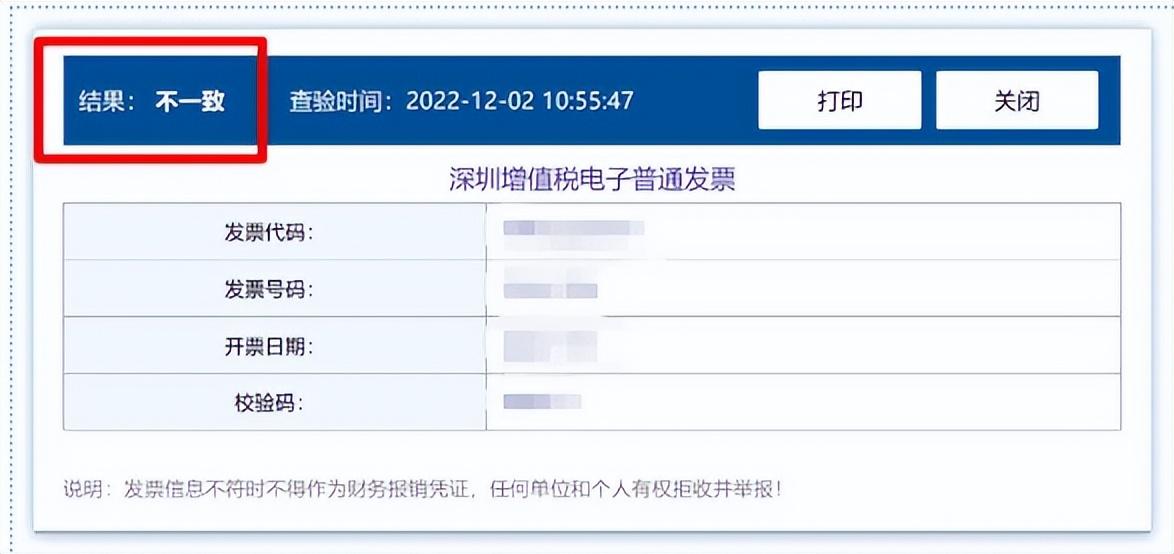 情况2:纳税人输入的发票查验信息与税务机关电子信息不一致,则显示“结果:不一致”的信息。