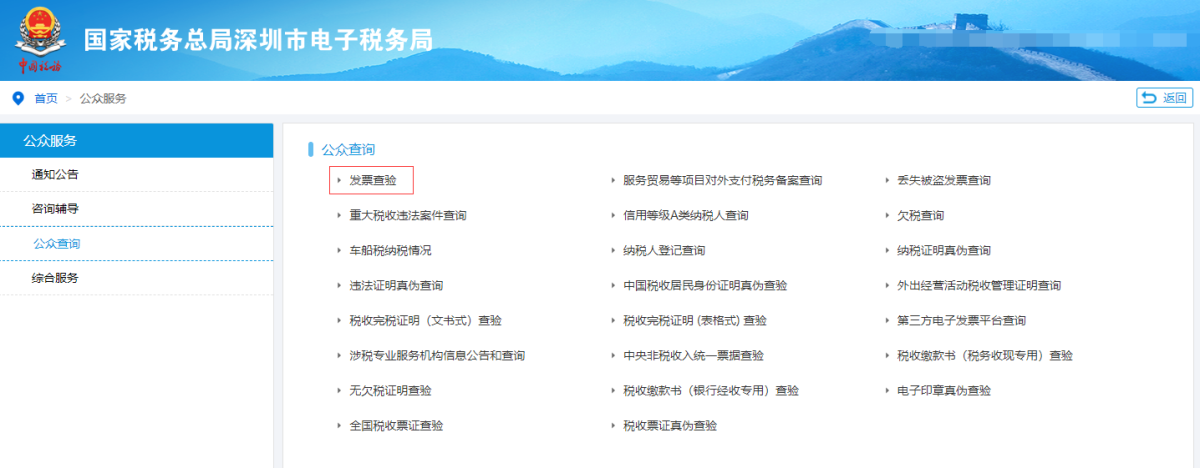步骤1:登录深圳市电子税务局,点击“公众服务-公众查询-发票查验”。或者微信关注“深圳税务”公众号,点击右下角“我要查-发票真伪查验”。