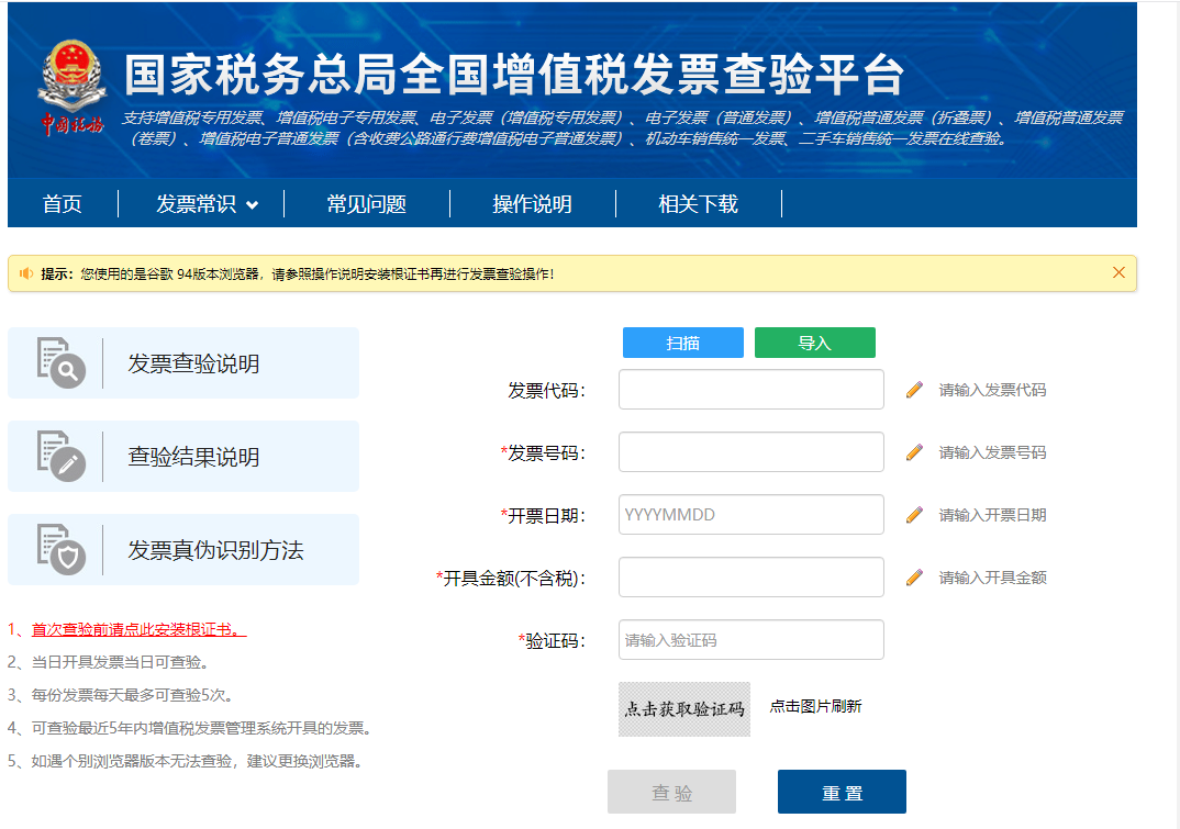 提示:如果首次使用查验平台,请根据操作指示安装根证书。
