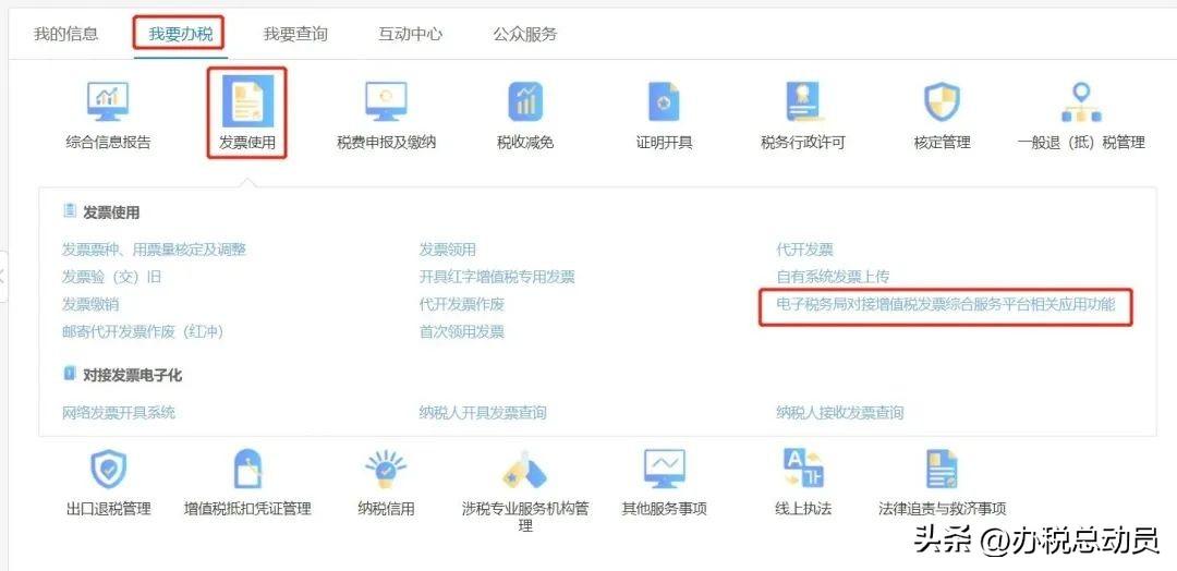 进入电子税务局,我要办税-发票使用-电子税务局对接增值税发票综合服务平台相关应用功能;