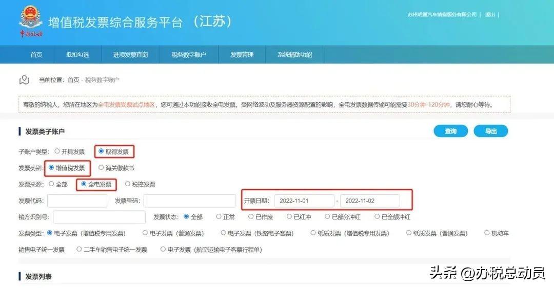 注意选择一下开票日期(系统默认是当月),选择好对应的全电发票的开具日期后(注意选择开票日期起止范围必须在同一个月内,比如选择10.1到10.31),然后点击查询;