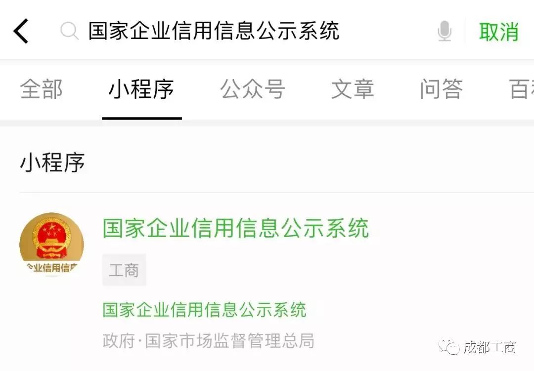 在微信菜单栏点击【发现】,列表中选取【搜一搜】,输入“国家企业信用信息公示系统”,选择搜索结果中的同名小程序,打开即可。