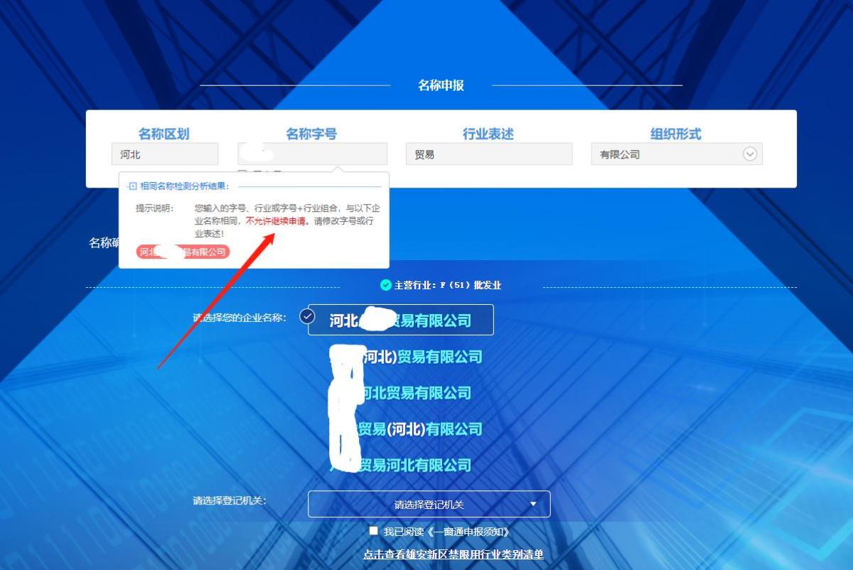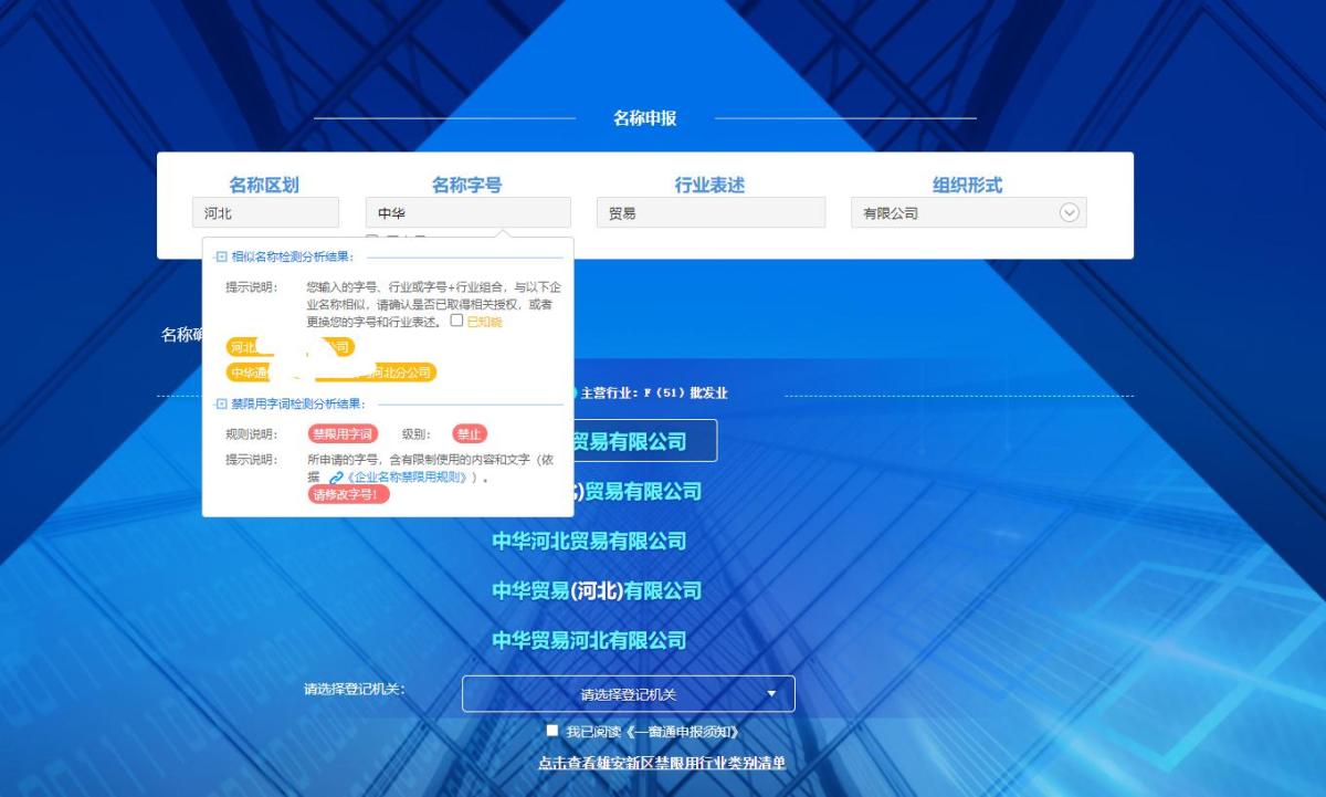 1)企业名称字号有与之相近的,系统会筛选各个行业的同音同字、同音不同字的,特别看一下自己选定的行业表述,只要是同行业的(例如自己申报的行业表述和系统里都为批发零售业),有系统筛选出来的,不建议使用该字号;若为不同行业,系统提示有同音不同字的、或者同音同字的,也可以试着去提交,因为核名的后台审批人员在核定名称之前都会先录入行业,在同行业查重。
