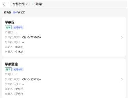 六、点击查询后就会在新页面中打开查询到的结果了,就可以看到和“苹果”相关的专利了;