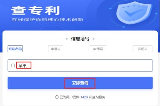 五、以专利名称查询为例,在输入框中填写需要查询的专利名称,我们先以“苹果”为例进行查询,输入“苹果”,点击查询;