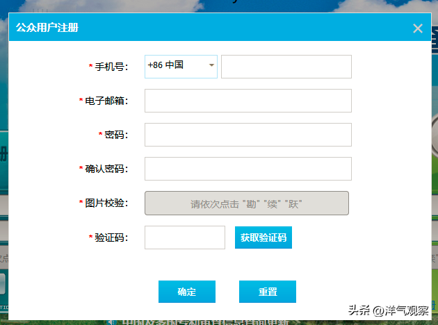 4、(公众用户注册)按照页面提示,完善(手机号、电子邮箱、密码、确认密码、图片校验、验证码)点击【确定】。