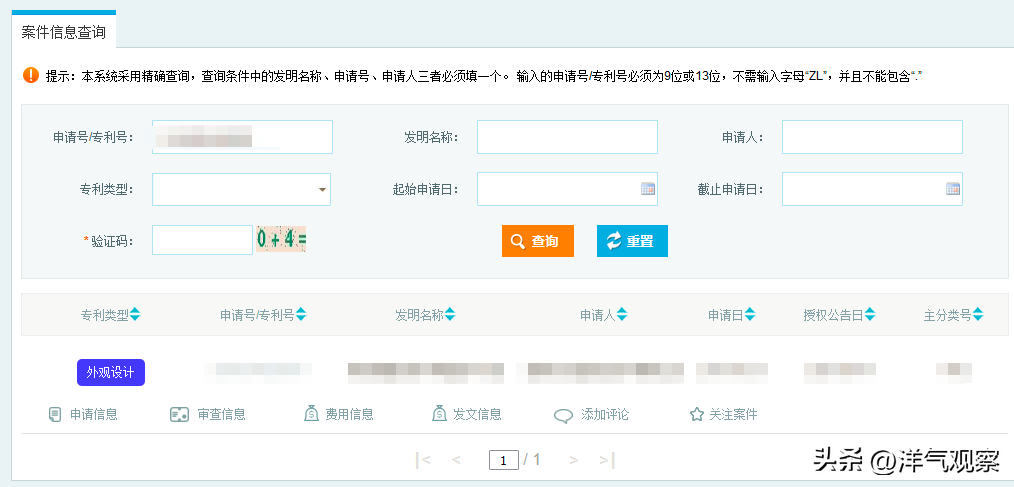 6、进入专利查询页,按照要求(查询条件中的发明名称、申请号、申请人三者必须填一个。 输入的申请号/专利号必须为9位或13位,不需输入字母“ZL”,并且不能包含“.”)输入查询条件,点击【查询】。
