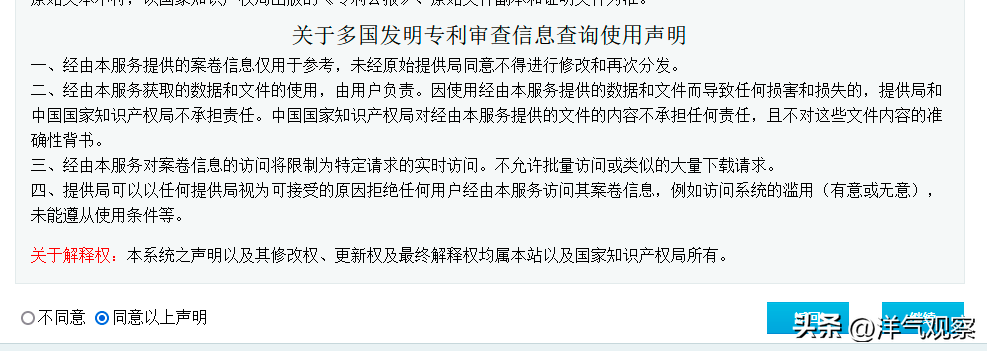5、进入(中国专利审查信息查询使用声明),点击(同意以上声明)点击【继续】。