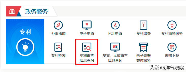 2、第二步:在【国家知识产权局】首页,找到(政务服务——专利)点击(专利审查信息查询)。