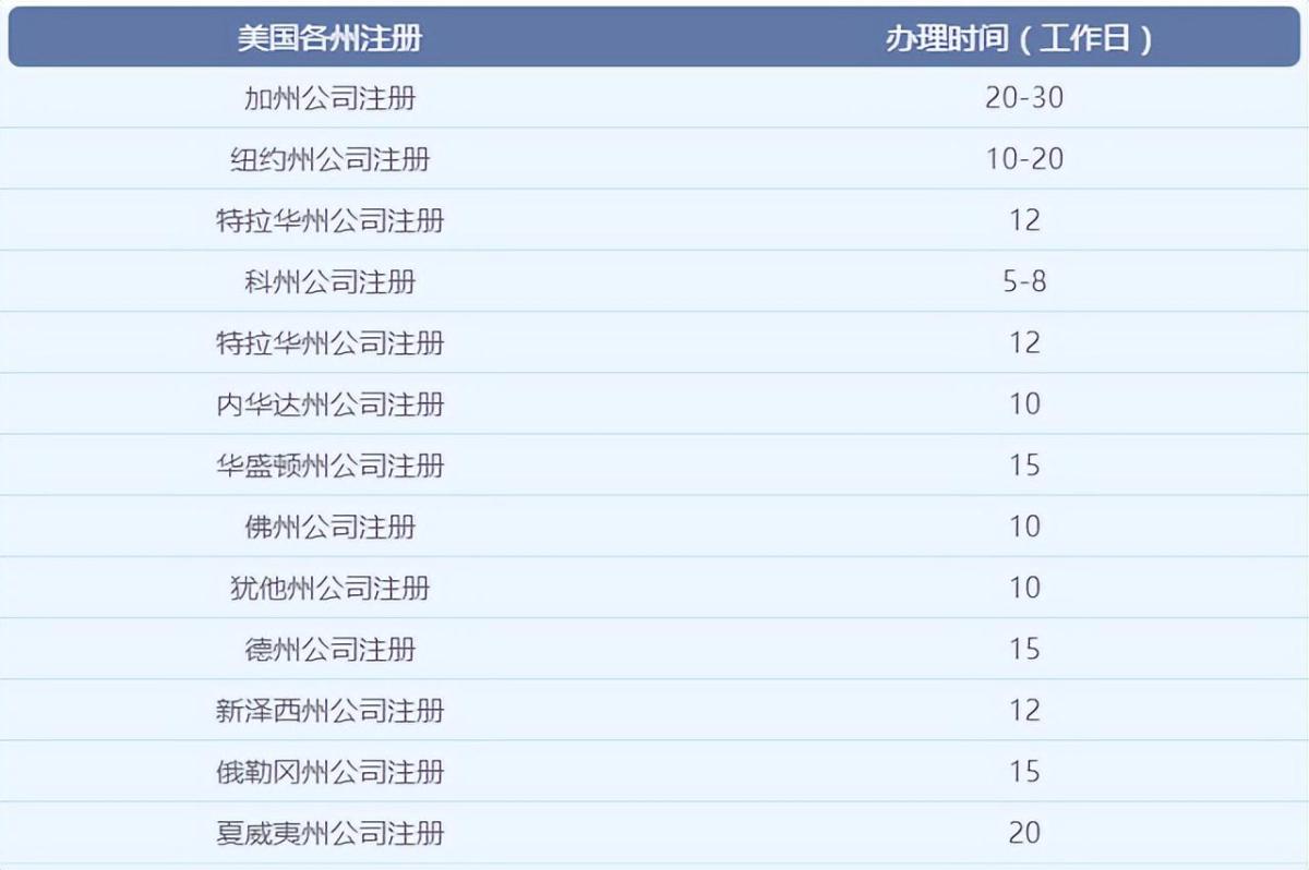 美国共有50个州可以注册公司,每个州注册的商业环境及政策有所差异,注册时间也有所不同。下表八戒列举了美国主要州的公司注册时间,如注册美国其他州公司,时间也差不多,具体可向八戒咨询。