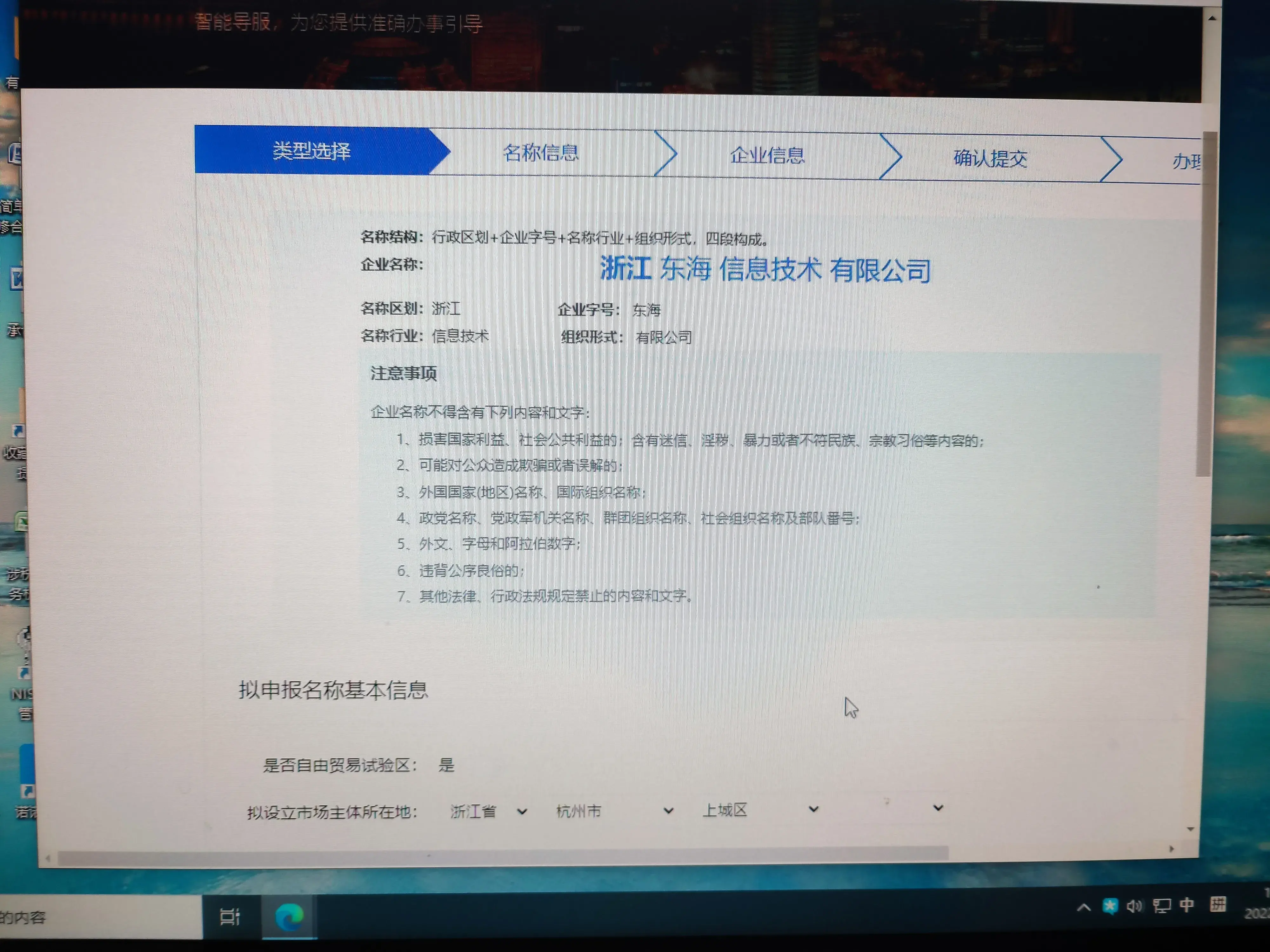 4、公司名称按网上的格式填好,格式是分行业固定的,只需要定下别人“格力”“奥克斯”这样的名字就可以了。