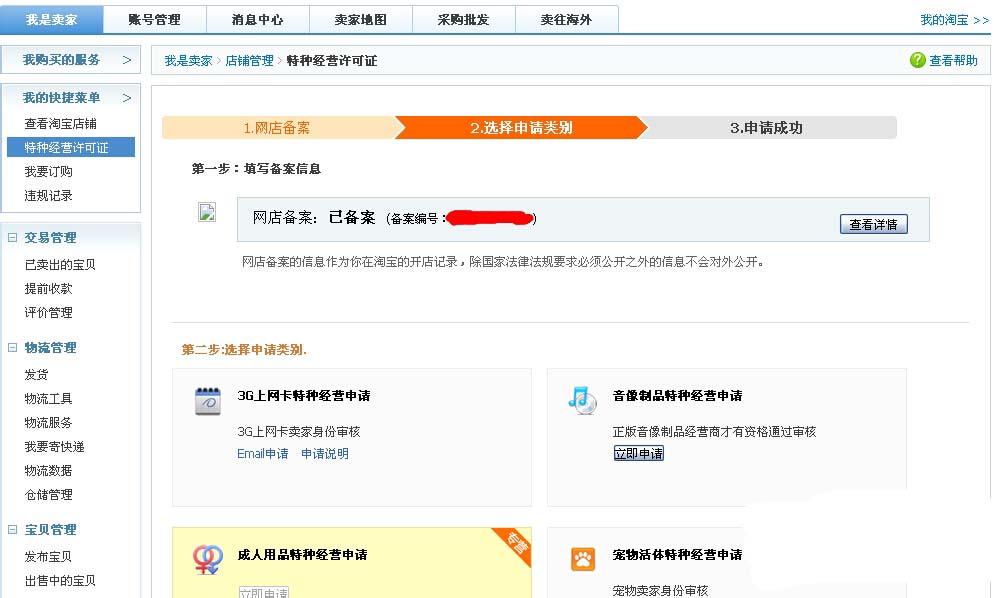 1、打开自己的淘宝网站后台,然后在“店铺管理”中找到“特种经营许可证”点击打开。(提示在正式申请前请下架淘宝全部宝贝)